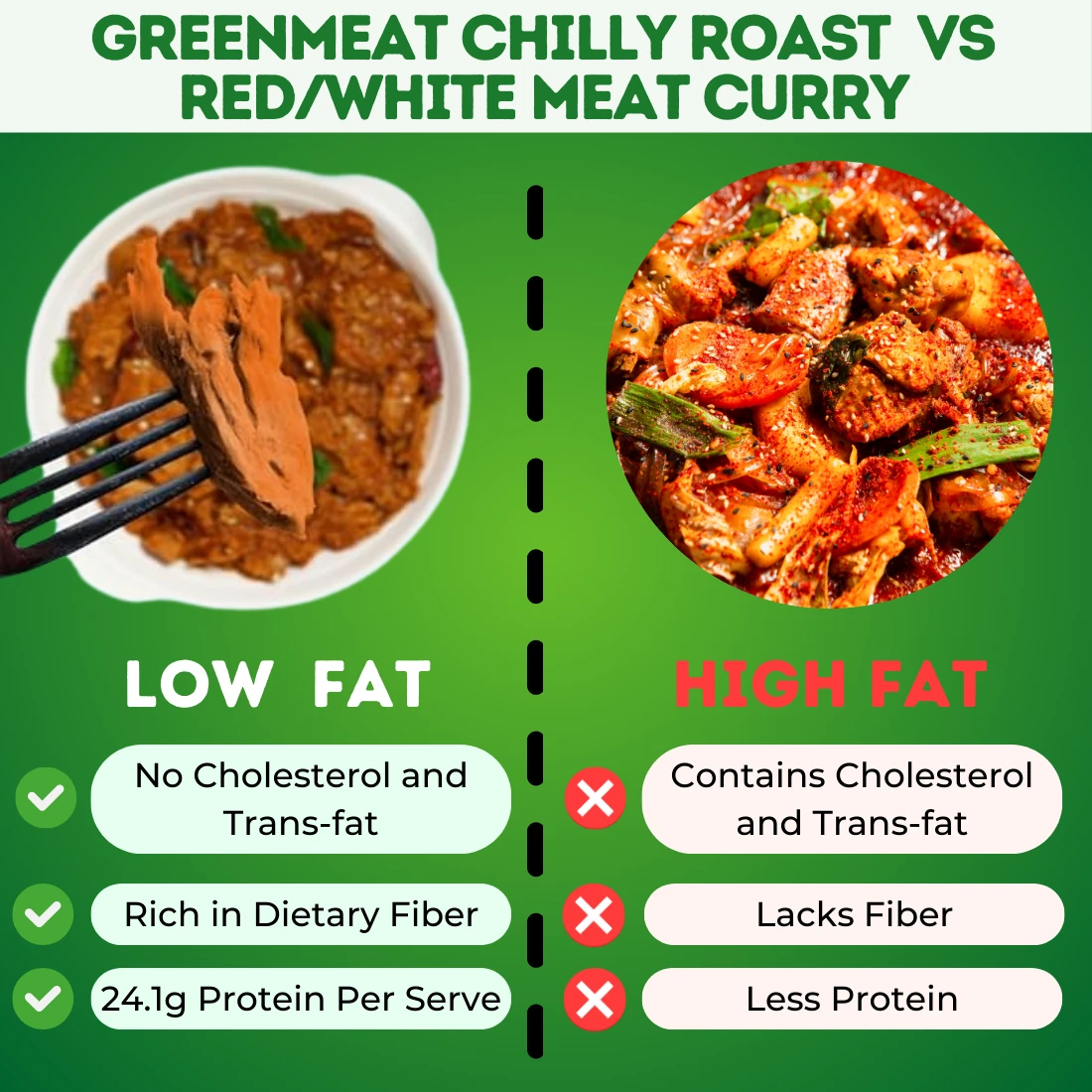 Looking for protein rich, healthy twist on your favorite spicy dish? Greenmeat Chilly Roast is the perfect pick. This ready-to-cook vegetarian roast is freshly prepared with rich, organic flavors and aromatic seasoning. Made with nutritious soy protein and pea, it offers a sustainable, cholesterol-free option packed with plant-based goodness. Enjoy a protein rich vegetarian dish that supports your health and wellness in an organic way. Choose smarter. Eat healthier.How it Compares to Meat