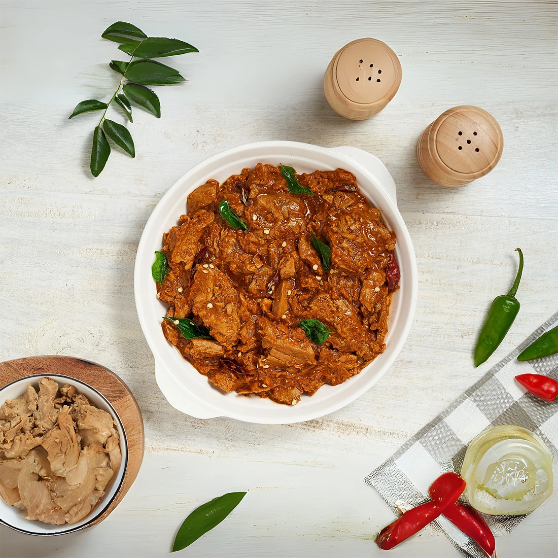 - Vegetable Protein Chunks {Pea Protein, Soy Protein, Dietary Fibre, Wheat Gluten, Corn Starch, Salt} Gravy {Water, Onion, Ginger, Garlic, Curry Leaves, Refined Coconut oil, Tamarind pulp, Kashmiri Chilli, Coriander, Peppercorn, Fenugreek, Fennel, Cumin, Turmeric, Salt}