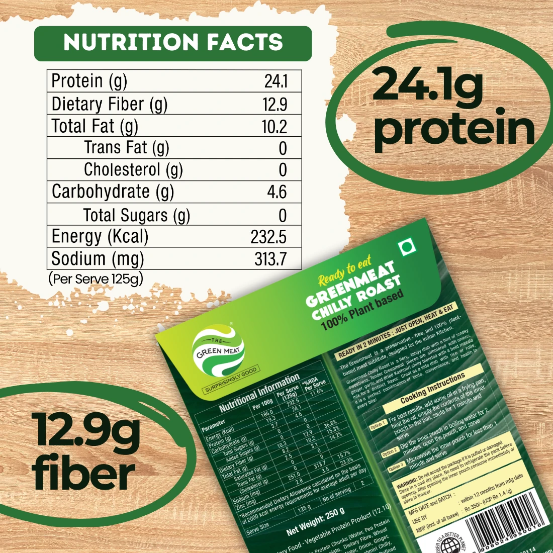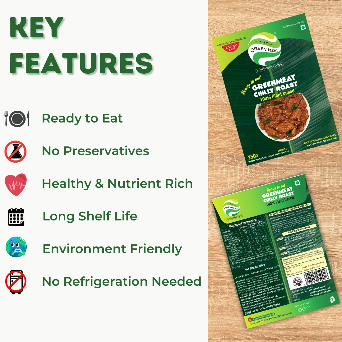 Experience traditional meat's rich flavour and satisfying texture with Greenmeat Chilly Roast, the ultimate protein-packed vegetarian alternative. Made with nutritious soy proteins and peas, this plant-based powerhouse delivers all the protein you need without cholesterol or artificial additives. Perfect for health-conscious food lovers, it's a delicious, plant based meat dish that fuels your lifestyle while delighting your taste buds. Make the smart switch today and enjoy a healthier, tastier way to eat!How to Buy Our Vegetarian Chili Roast?