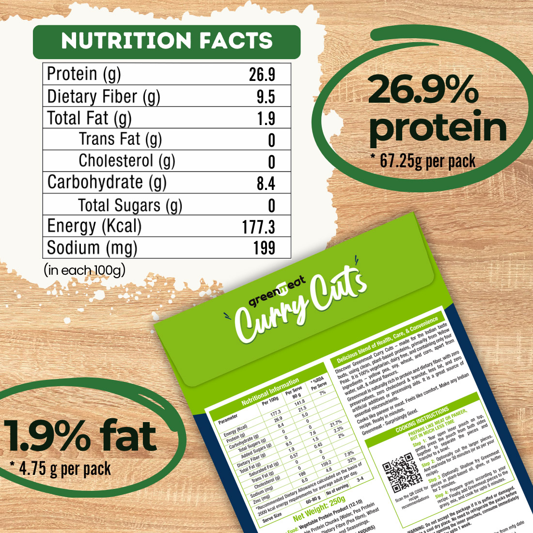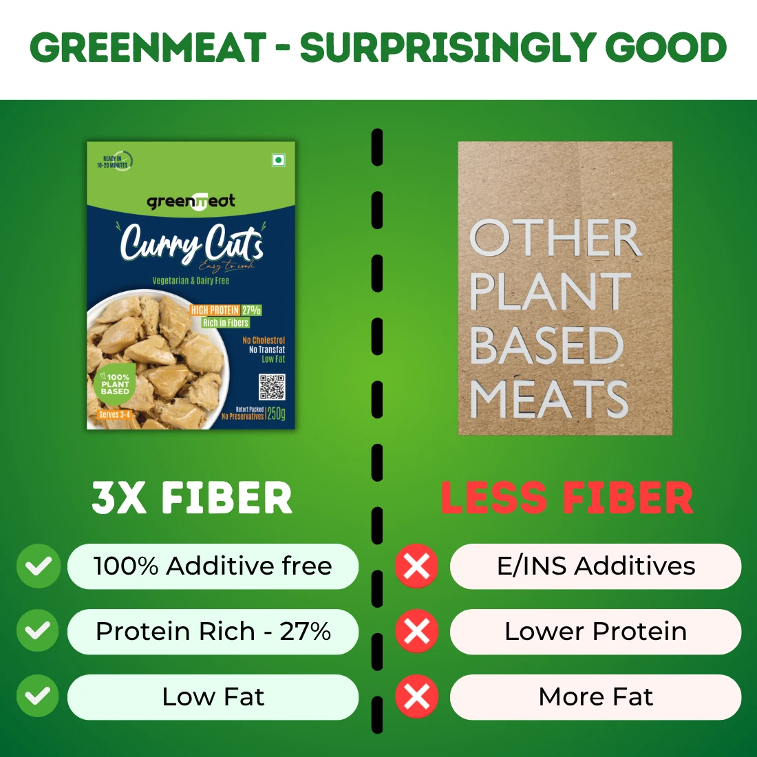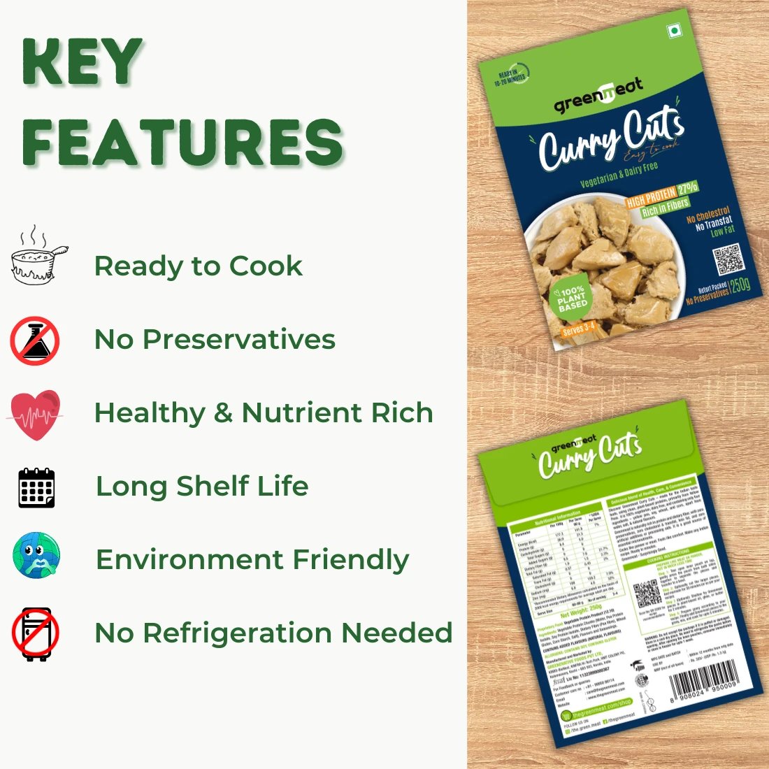 - Healthy, versatile, 100% plant based meat substitute in the form of curry cuts / chunks, designed for the Indian Taste Buds.