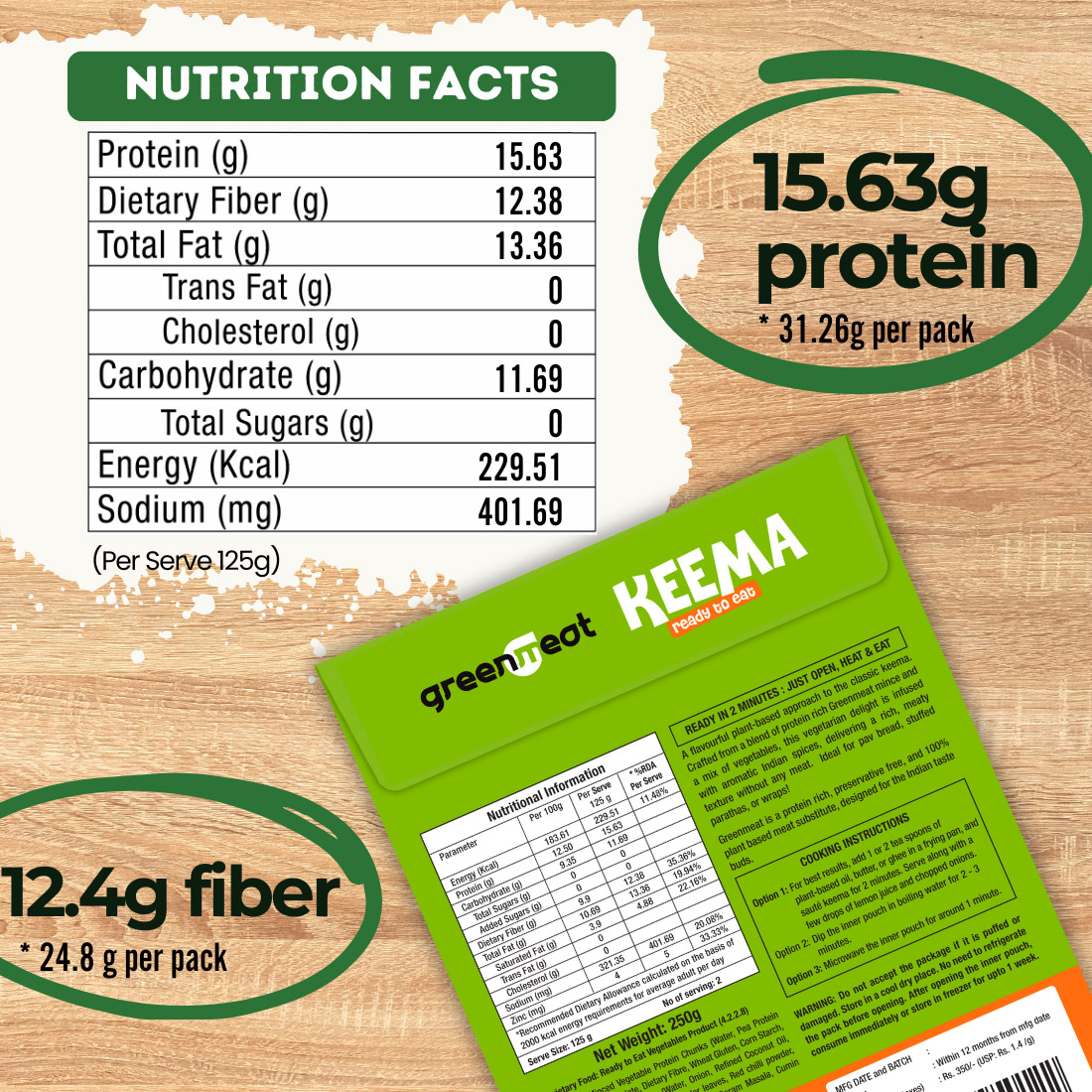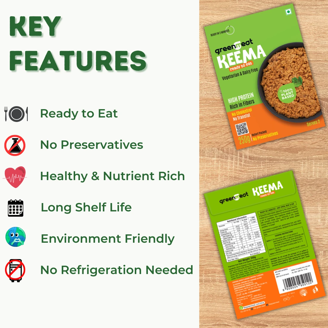 No need of soaking, washing, or pre-soaking needed. Greenmeat Keema is a Ready to Eat dish – just microwave it or heat it on a pan for upto 2 minutes and Greenmeat Keema is ready!