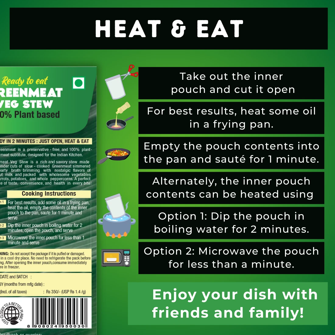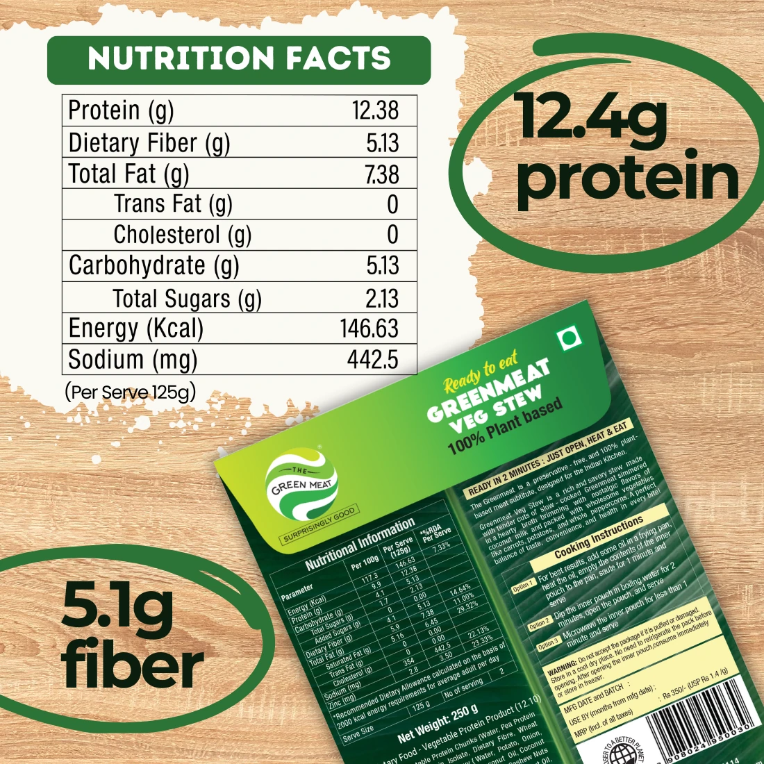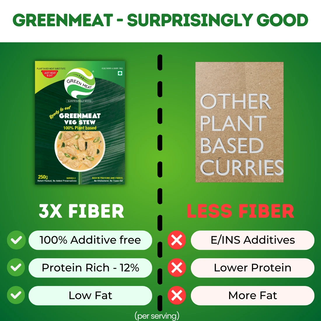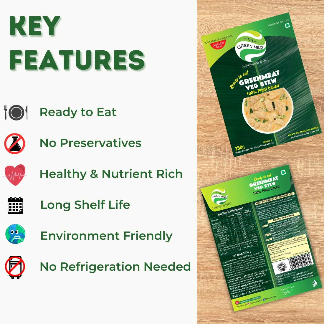 GreenMeat Veg Stew is a convenient, ready to cook vegetarian stew packed with taste and nutrition. It mimics the texture and flavour of classic vegetarian mutton stew using sustainable plant based meat ingredients. This ready to cook vegetarian stew saves time without compromising quality. Made with natural spices and creamy coconut milk, it is perfect for a quick, hearty meal.Why GreenMeat’s Vegetarian Stew Stands Out